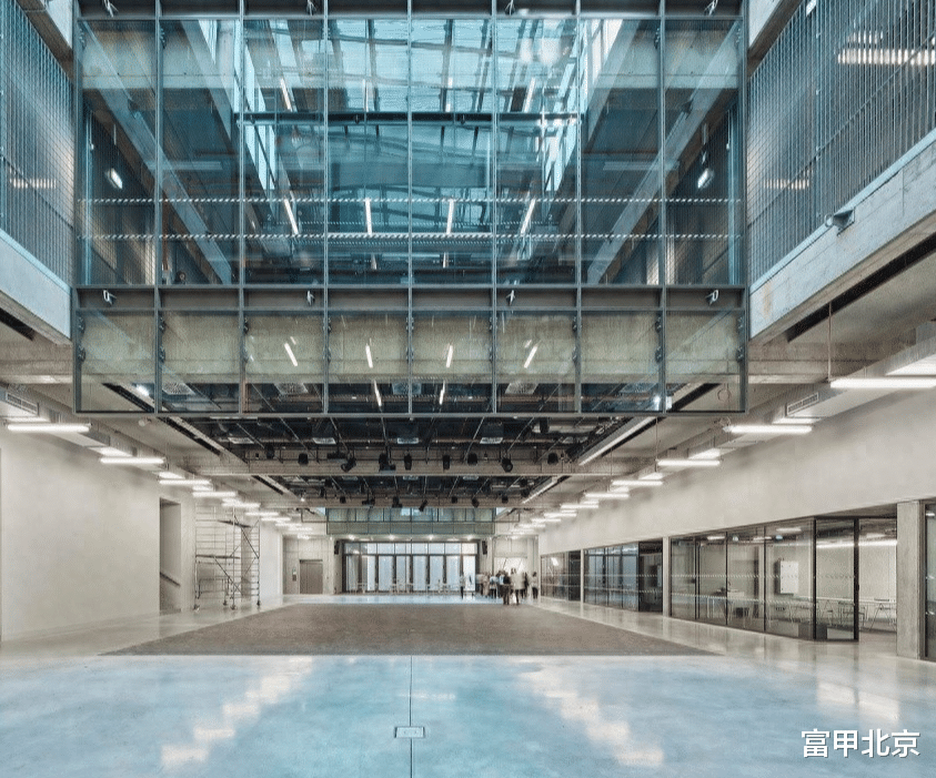 大厅的覆盖设计使得大型项目得以顺利进行,保证学校全年稳定运营。技术设施集中布置在建筑的侧翼,而光线设施则位于中央区域。这种布局既允许自然光的充分进入,又在视觉上将中央的半透明设施与整个空间连接起来。