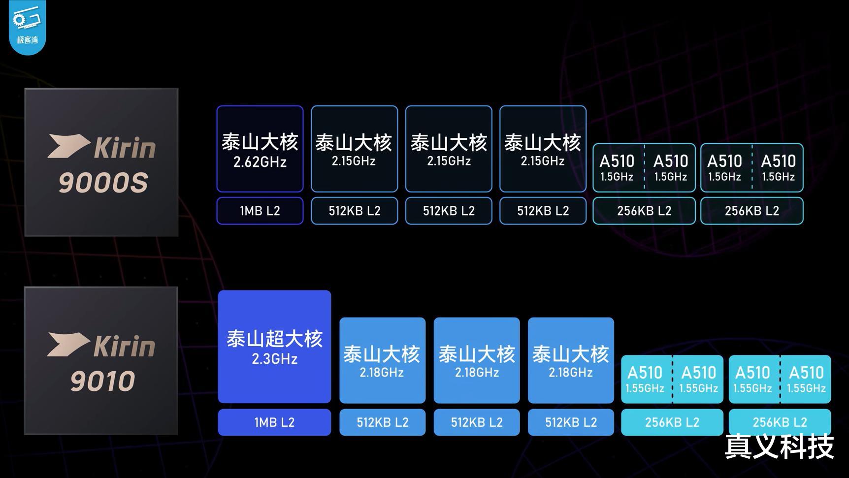 4,麒麟9010S:在麒麟9020基础上将CPU大核与小核分别降频至2.05GHz与1.5GHz——多核性能接近骁龙8+,但在GPU部分却巨幅阉割成了2簇——性能已低于骁龙865。