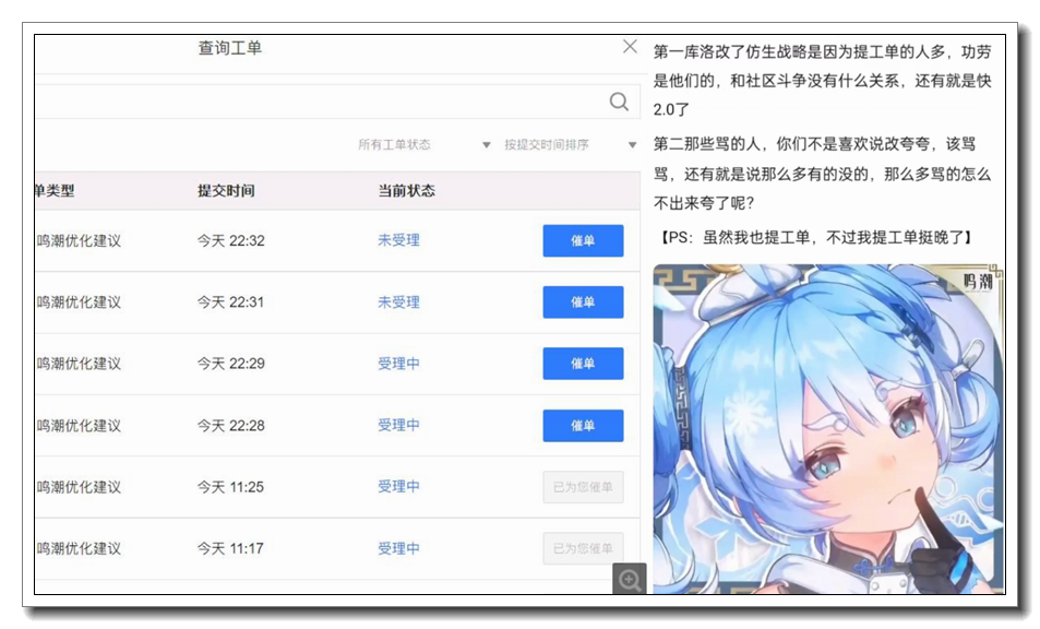 好的反馈与过分的意见都有许多,更是在今汐皮肤处理事件好评后,玩家进行的工单次数开始了激增倍增。没记错的话,之前制作人在采访时说过,鸣潮积压了10万工单,现在工单热度的背景下,压积的工单可能不止这个数,因为有人截图发现,当天(4日)客服处理相比之前慢迟许多,关键词“受理中”成了常态。