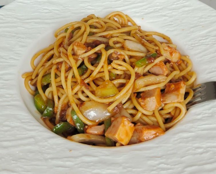 最终成品的意面根根裹上微润的色泽,鸡肉鲜嫩入味,带着奥尔良风味特有的微甜与辛香,其间又隐约透出湘式快炒的锅气。青红椒和洋葱的加入,不仅增添了清脆的口感,也让整道菜的色彩更为明快诱人。