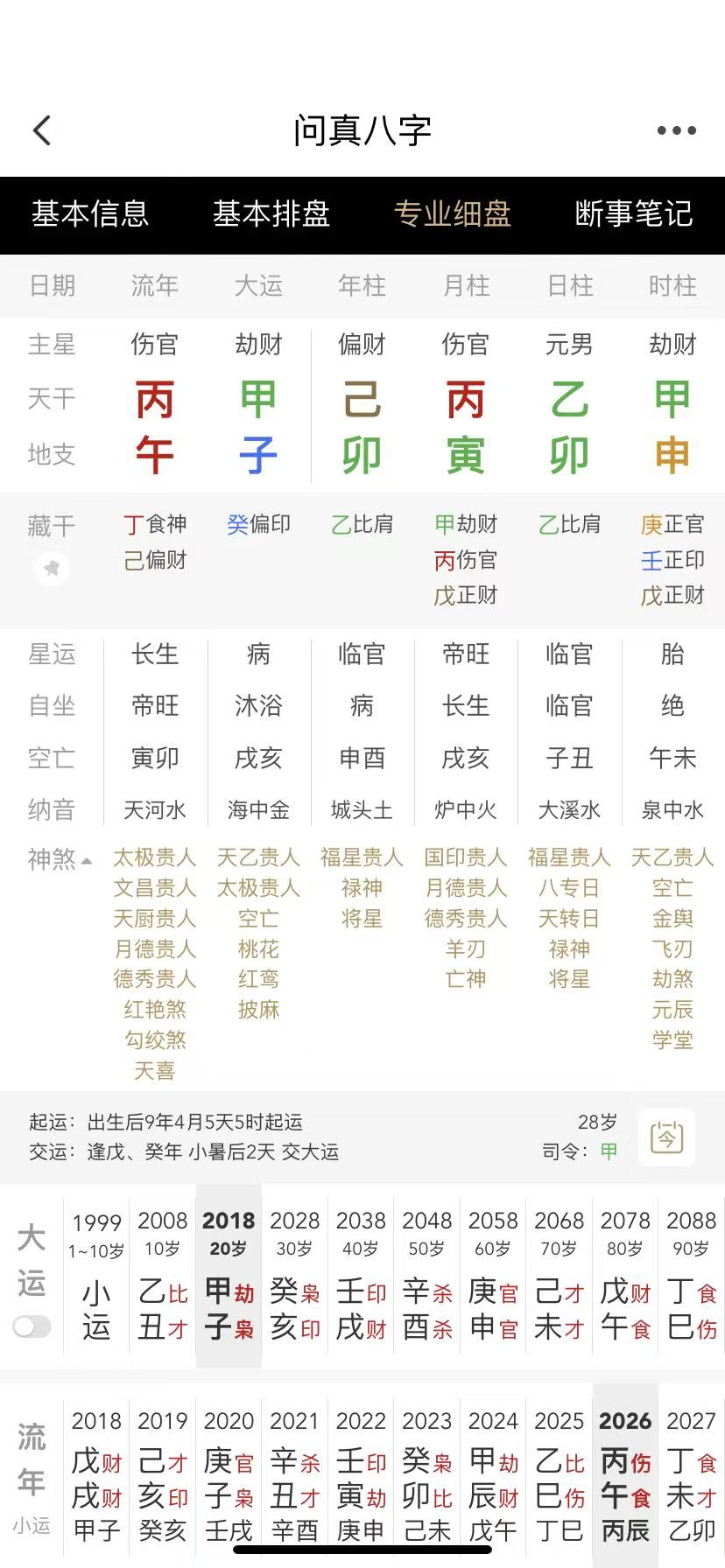 大运:乙丑,甲子,癸亥,壬戌,辛酉,庚申,己未,戊午,丁巳,10岁运。