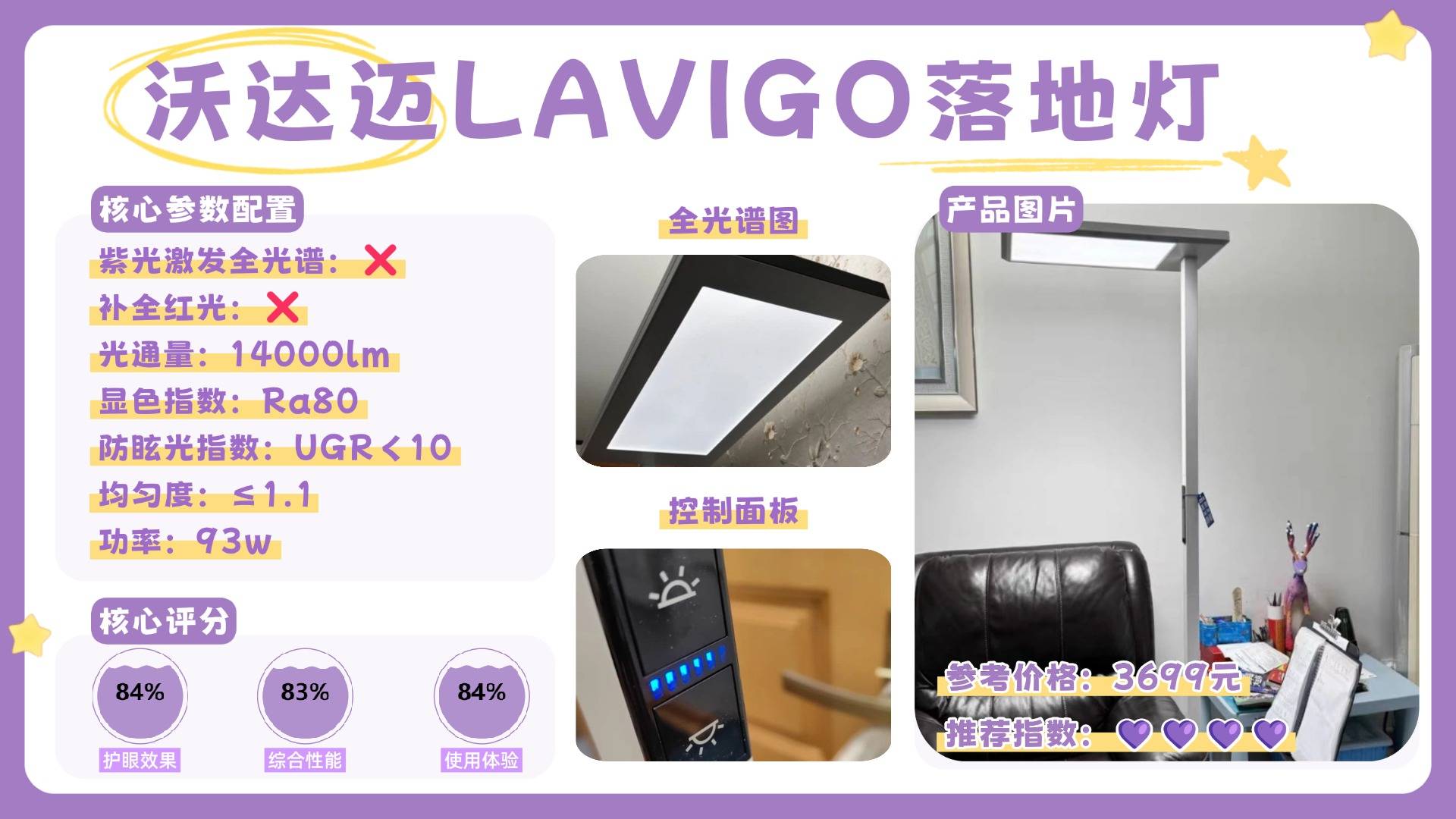护眼大路灯第九名:沃达迈LAVIGO落地灯;能够呈现14000lm的光通量,亮度表现充足。