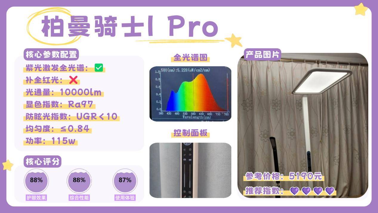 护眼大路灯排名前十的品牌有哪些?柏曼骑士I Pro整体光通量约9500lm,光线明亮且覆盖面积宽广。灯头采用矩形发光面,结合侧向出光设计,使光线柔和均匀,明暗落差不明显,并能有效降低眩光,实测防眩光指数约为10。功能方面支持2700K–5700K宽色温调节,并提供自定义休息提醒。整体来看,柏曼骑士I Pro完整度较高,但定价偏高,更适合预算充足、对光环境要求较高的伙伴。