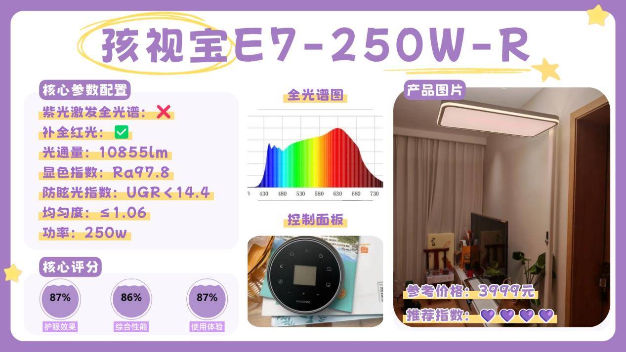护眼大路灯排名前十的品牌有哪些?孩视宝E7-250W在光学设计上采用上、中、下三向出光方式,以提升整体照明的覆盖范围和均匀度,顶部配备四重透镜光学系统,侧面加入环形补光结构,多维漫射让光线更柔和,使室内光环境更平衡舒适, 功能方面增加了节律照明模式,可模拟自然光随时间变化的节奏,不过作为系列顶配型号,其价格偏高,整体性价比一般,更适合对配置有较高要求的伙伴选购。