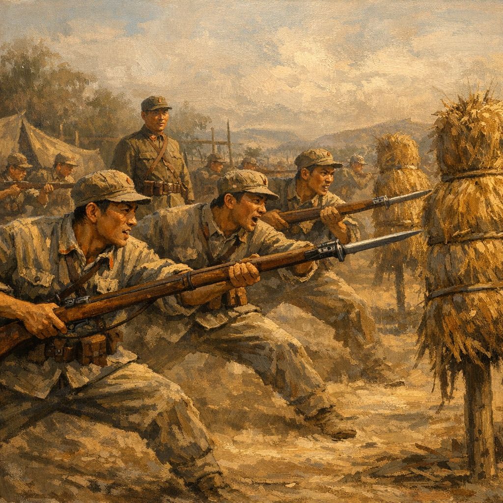 日军的刺杀教范非常详细,从持枪姿势、突刺角度、防守反击到多人配合,每一个环节都有标准化的动作规范。新兵每天要花大量的时间练习突刺和格挡,一个动作重复上千遍直到形成肌肉记忆。