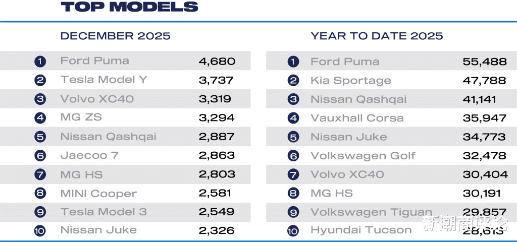 最受欢迎的十款车型分别是福特Puma、起亚狮跑(Sportage)、日产逍客(Qashqai)、沃克斯豪尔Corsa、日产Juke、大众高尔夫、沃尔沃XC40、名爵HS、大众途观(Tiguan)、现代途胜(Tucson)。最畅销的电动车是特斯拉Model Y,共售出24,298辆,但未能跻身前十。