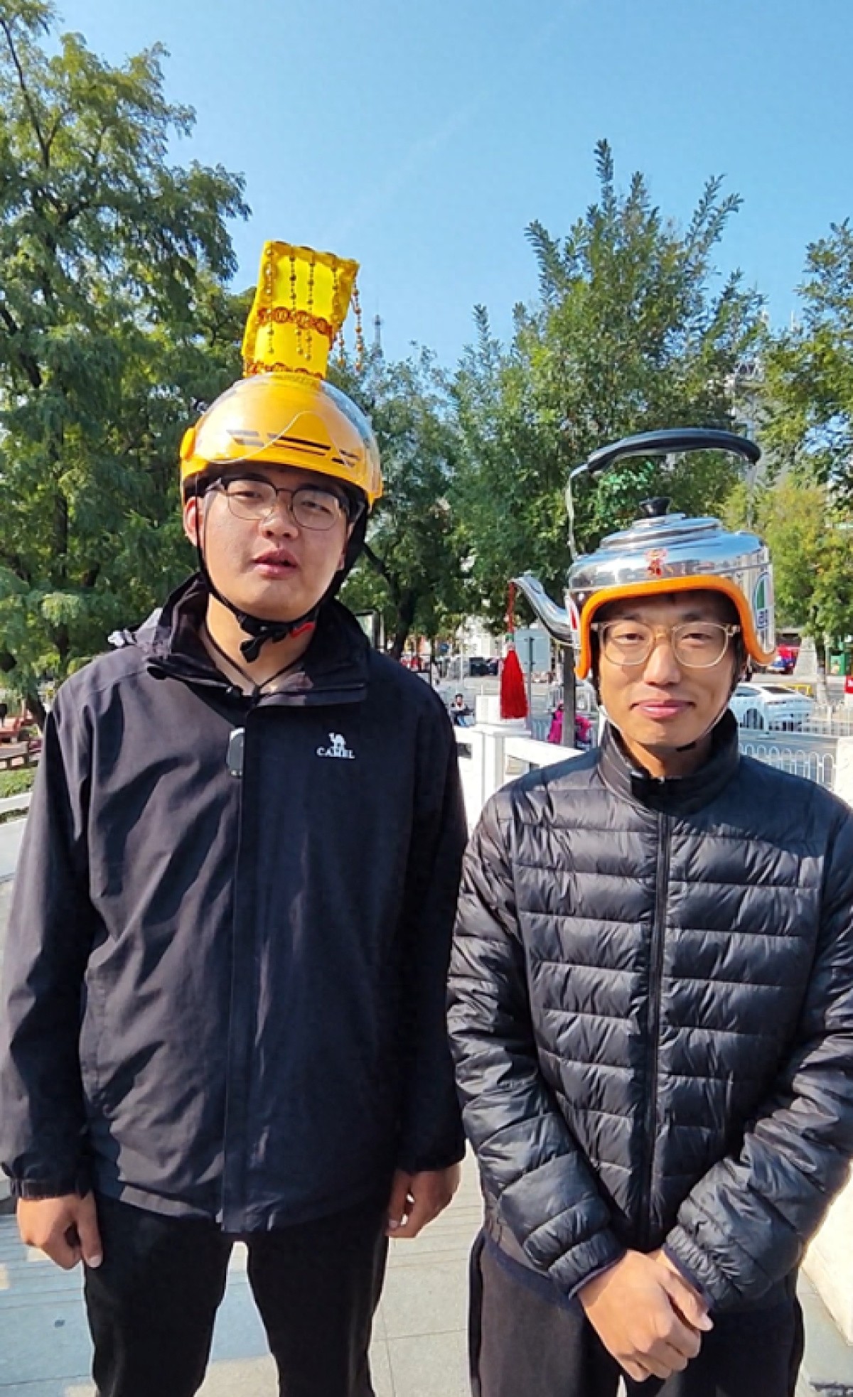 记者见到袁靖昂和李钱深时,他俩正在许昌市曹魏古城南门南关桥附近“趴活儿”,街面上,他俩显得格外显眼,袁靖昂戴着“秦始皇的冕旒”,李钱深戴着“一把水壶”。
