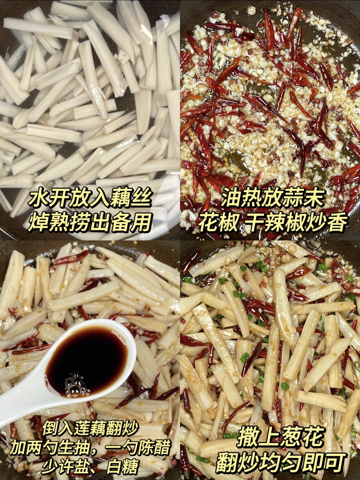 紧接着,将沥干水分的藕丝倒入锅中,转大火快速翻炒。藕丝在高温下会迅速变色,此时加入一勺白醋,不仅能保持藕丝的洁白,还能增加其脆爽度。翻炒约一分钟,藕丝开始变得透明,加入一勺生抽提鲜,少许盐和糖调味,再根据个人喜好加入适量的辣椒粉和花椒粉,继续大火快炒,让每一根藕丝都均匀地裹上麻辣的红油。最后,放入切好的青椒丝,翻炒断生即可出锅。