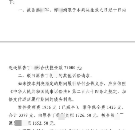 熊武军当初说好无论盈亏都保证返还本金,可如今,这钱像是石沉大海,熊武军把钱揣进自己腰包,利息赖着不付,本金也拖了一年多,只还回个零头。直至2025年10月,熊武军仅返还2.3万元,剩下的 7.7 万成了泡影。2025年1月,熊武军出具承诺书确认欠款,但到期后仍未履行。据法院相关文书,该笔款项被认定为合伙投资款,法院判决熊武军、谭艺娟需返还7.7万元,可执行的影子都没见着,丁德彬每月还得自己扛着贷款利息,像座大山压得他喘不过气。