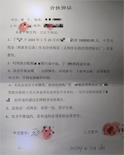 据丁德彬叙述,同母异父的大哥谭国元与他的女婿熊武军合谋,于2023年5月让丁德彬开自己贷款购买的车,去广东惠州熊武军公司帮他运输沙石。2024年1月28日,丁德彬与熊武军达成合伙协议,熊武军虚构事实,在本人毫不知情的情况下,蒙骗丁德彬贷款10万元用于砂石生意,利润按六四分成,且无论盈亏,熊武军需保证返还10万元本金。他揣着满心信任,把十万块血汗钱投给亲戚熊武军,盼着能为家添点进项,没成想这钱刚转过去,所谓的砂石生意三天就黄了。