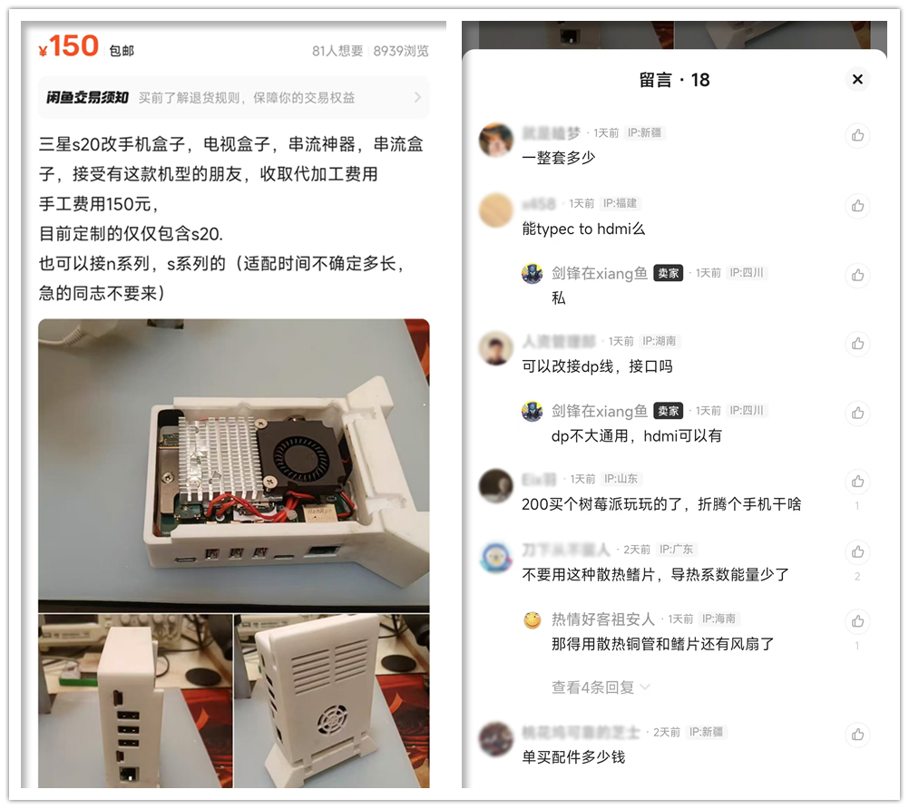 就目前来看,三星S20仍旧是最适合改盒子的手机,因为骁龙865+12G的组合无懈可击。当然这里指的是屏幕损坏、主板完好的残机,没人舍得用正常的S20去改的。目前屏损S20或S20裸板的价格大概240元左右,自己动手改造的话,物料费大概一百来块。