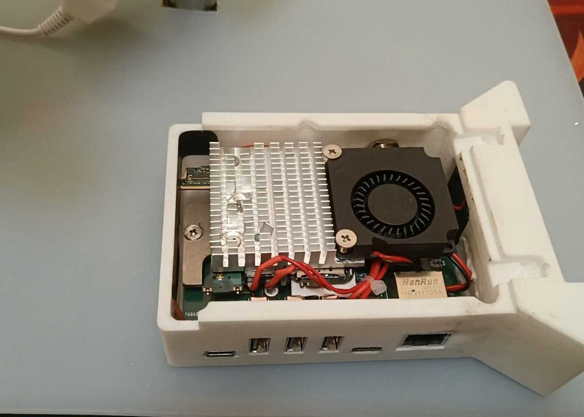 机器内部造型是这样,几层堆叠在一起,第一层是鳞片散热板和散热风扇,下面那层是S20主板,焊接了HanRun网口和USB接口。有人会问为啥不焊个HDMI接口?因为三星S20本身自带DeX一线传功能,直接用C口转HDMI就行。