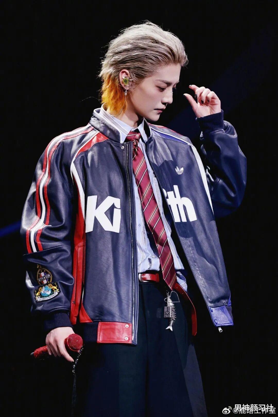 鹿晗之前这一身就很出圈。深蓝色的拼接皮衣,红白色条纹亮眼,整套look在机车风中混入了学院气。有点坏、有点乖,恰到好处的少年感。