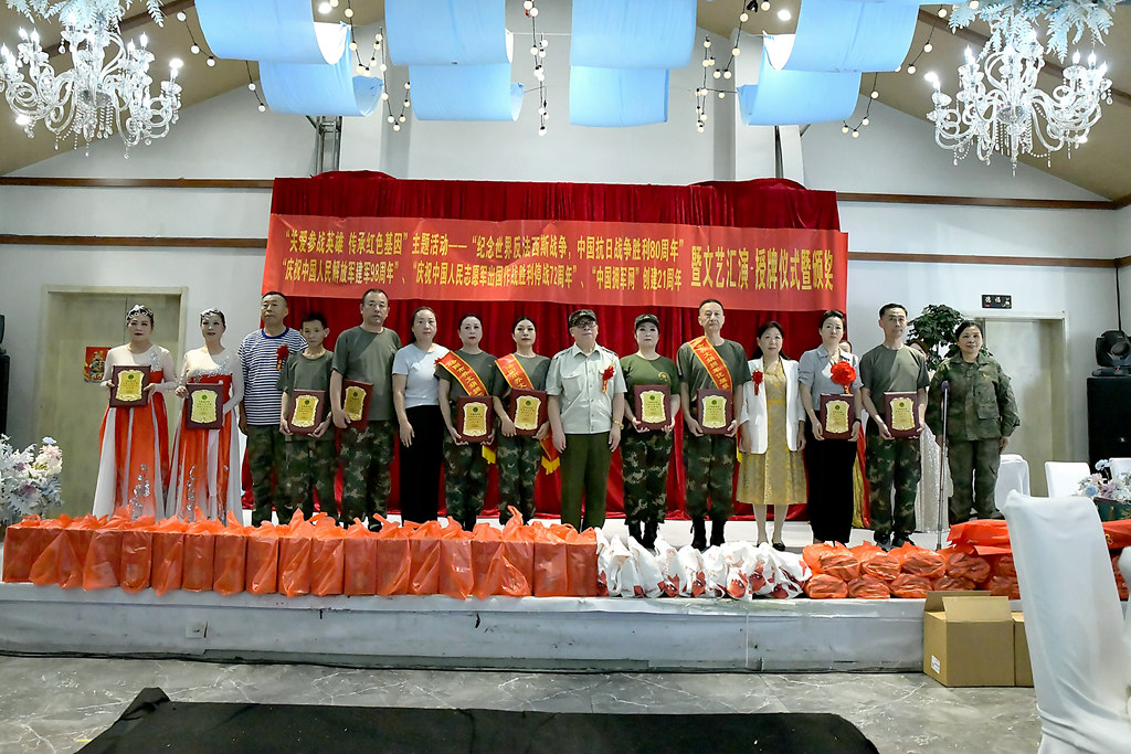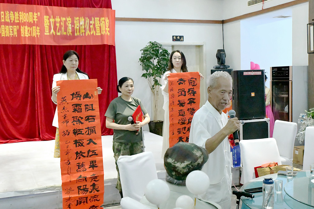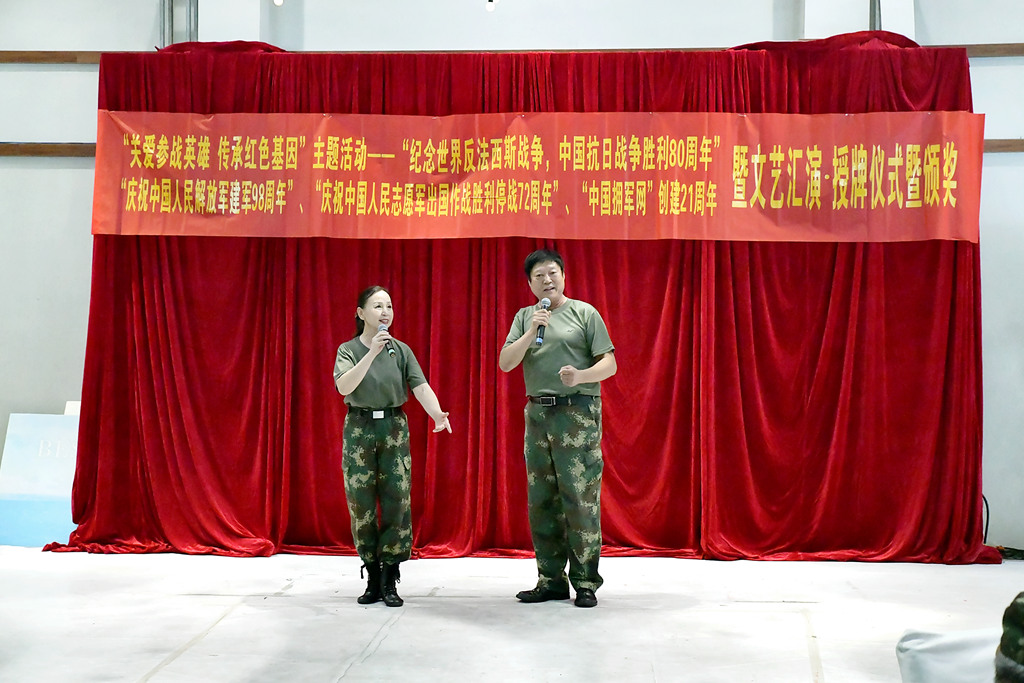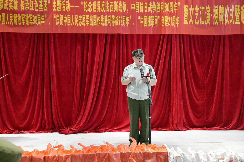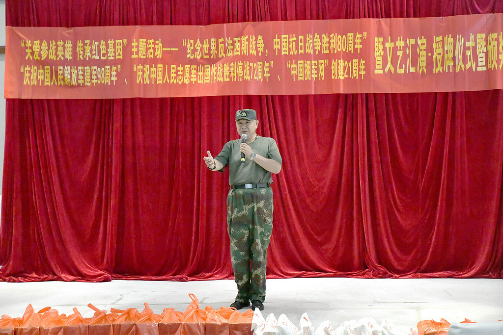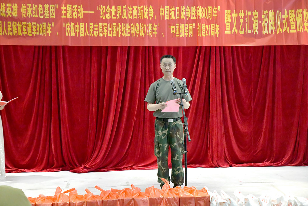 尊敬的各位领导,同志们、朋友们,志愿军英雄代表、对越自卫还击战的英雄代表,尊敬的各位爱心企业家,各位爱心人士,新闻媒体朋友,大家下午好。今天,我们在这里召开,纪念世界反法西斯战争,中国抗日战争胜利80周年、 庆祝中国人民志愿军出国作战胜利停战72周年、庆祝中国人民解放军建军98周年,中国拥军网创建21周年”暨文艺汇演。爱心企业家,各位爱心人士,感谢你们。