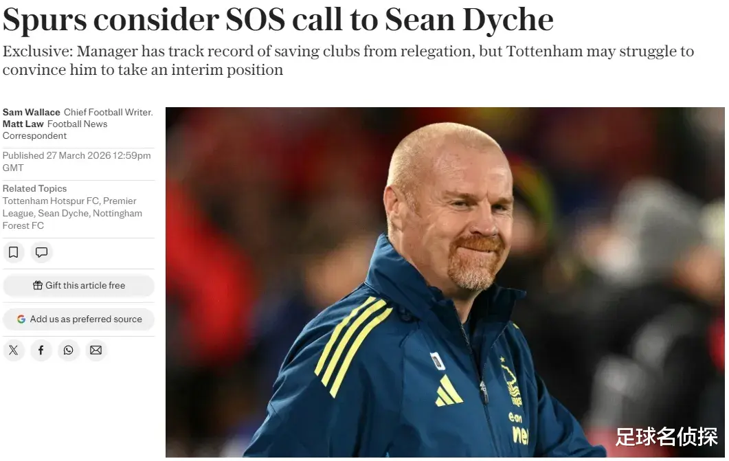 电讯报主编SW和记者ML联合发文表示,热刺正考虑任命肖恩-戴彻为救火教练,以帮助他们免于降级。