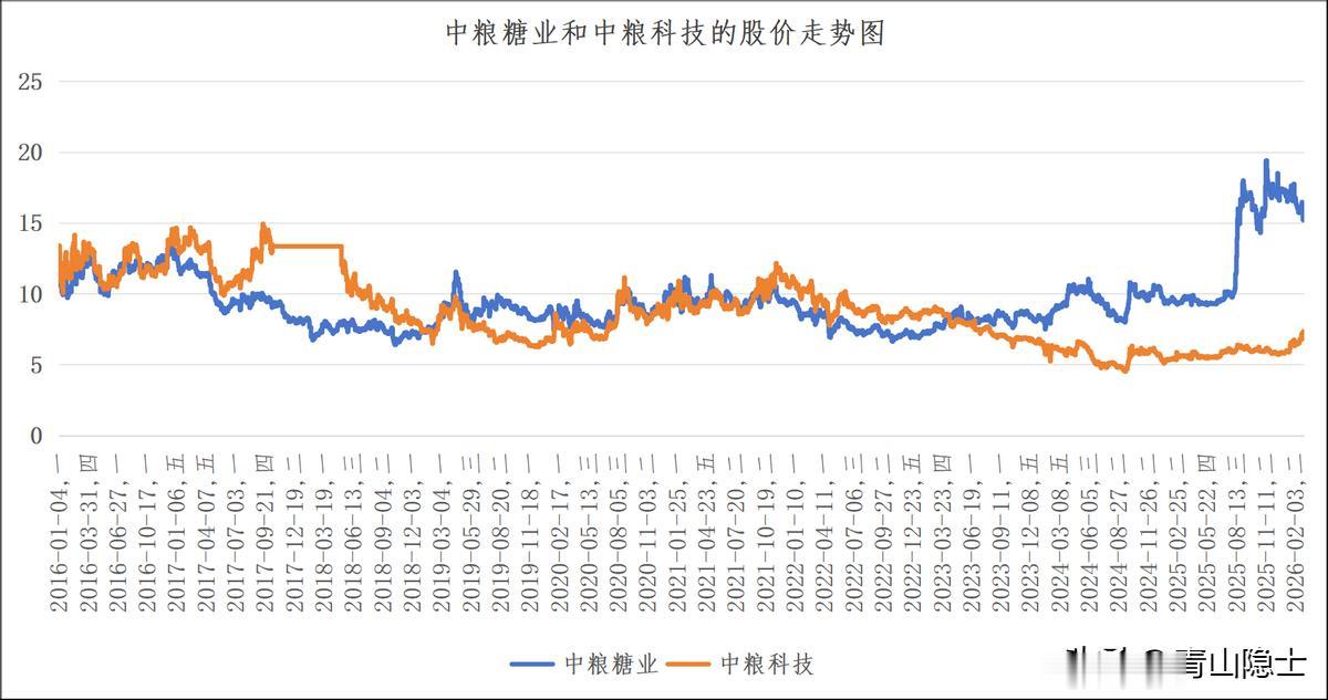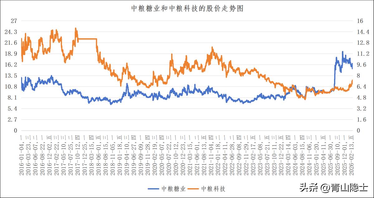 尤其2024年四季度至2026年初,分化格局进一步加剧:中粮糖业受食糖行业景气度上行催化,股价迎来一轮强势主升行情,从10元附近区间最高冲高至近20元,区间涨幅接近翻倍;而同期中粮科技仅出现小幅跟涨,股价始终在5-8元的低位区间震荡,二者股价价差创下2016年以来的历史新高,此前长期稳定的联动格局被阶段性打破。