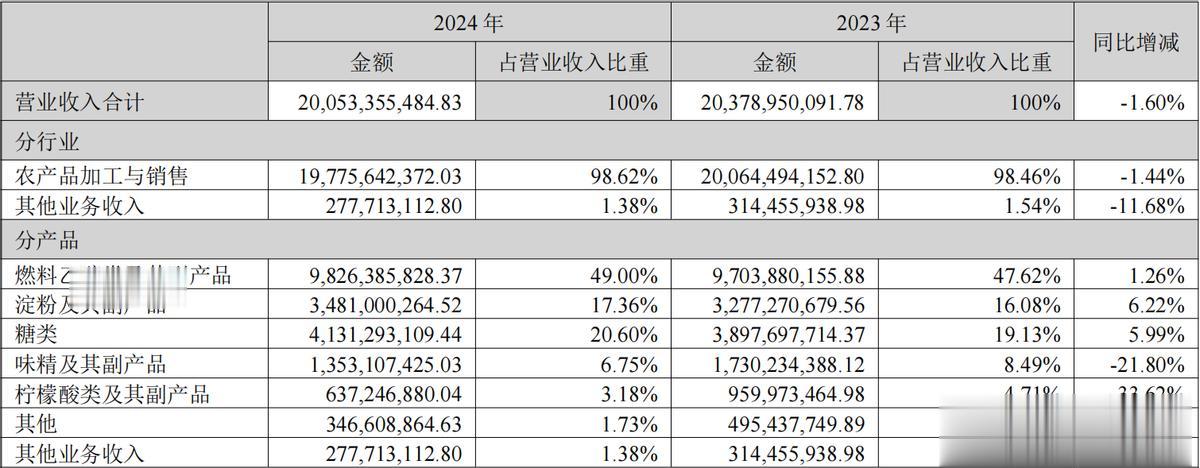 反观中粮科技,根据其2024年年报,公司以农产品加工为核心主业,收入占比近99%。其中,燃料乙醇类及其副产品为第一大收入来源,占营收近半;糖类与淀粉及其副产品分别以20.60%和17.36%的占比构成第二、第三大业务板块,且糖类、淀粉类收入均实现正增长,而味精、柠檬酸等传统品类收入则有所下滑。
