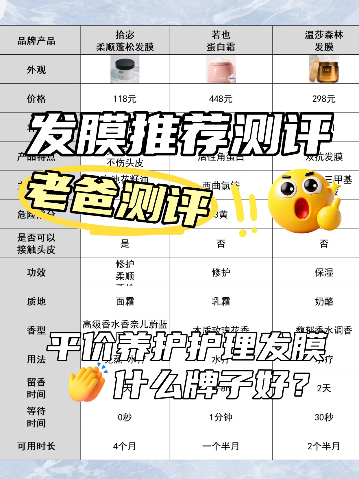 好多宝子问什么牌子的发膜最好,还总参考测评内容,想花小钱办大事,今天我就结合实测,跟大家唠唠实在的!先解答两个核心问题:发膜有必要买贵的吗?发膜哪些成分安全好用?真的没必要买贵的,花小钱也能买到好用的发膜,很多贵价款溢价全在品牌和包装,成分和同价位平价款没区别,甚至不如平价款扎实。安全好用的发膜,成分要简单纯粹,优先选水解蛋白、角鲨烷、泛醇这些修护成分,能渗透发芯、修复受损毛鳞片,避开过量香精、矿物油、风险防腐剂的款就行,这些成分不仅不安全,还可能让头发变得更差。我测评过不少平价发膜,发现有的款成分扎实,修护效果一点不输贵价款,还有的款价格便宜,但成分劣质,只能暂时假滑,根本达不到 “花小钱办大事” 的效果。很多人踩坑,就是觉得贵的才好,忽略了平价款的实力。下面是我总结的发膜选购注意事项,干货满满,可以先赞收藏。