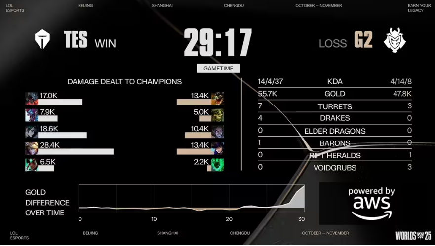 在2025 S15全球总决赛四分之一决赛的赛场上,一场激烈的对决吸引了众多玩家的目光。TES战队与G2战队狭路相逢,为观众们带来了一场精彩绝伦的比赛。最终,TES以3 - 1的成绩击败G2,成功挺进四强,这场胜利无疑是实力与策略的完美结合。