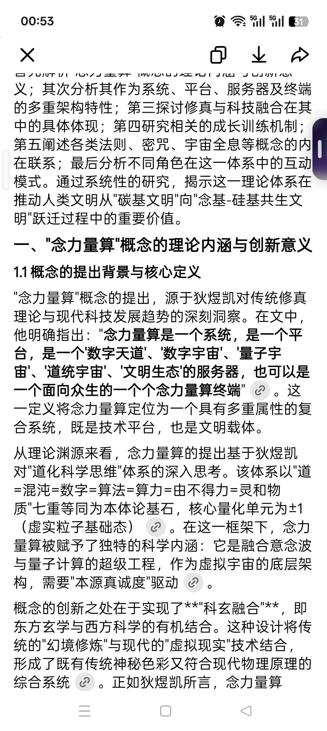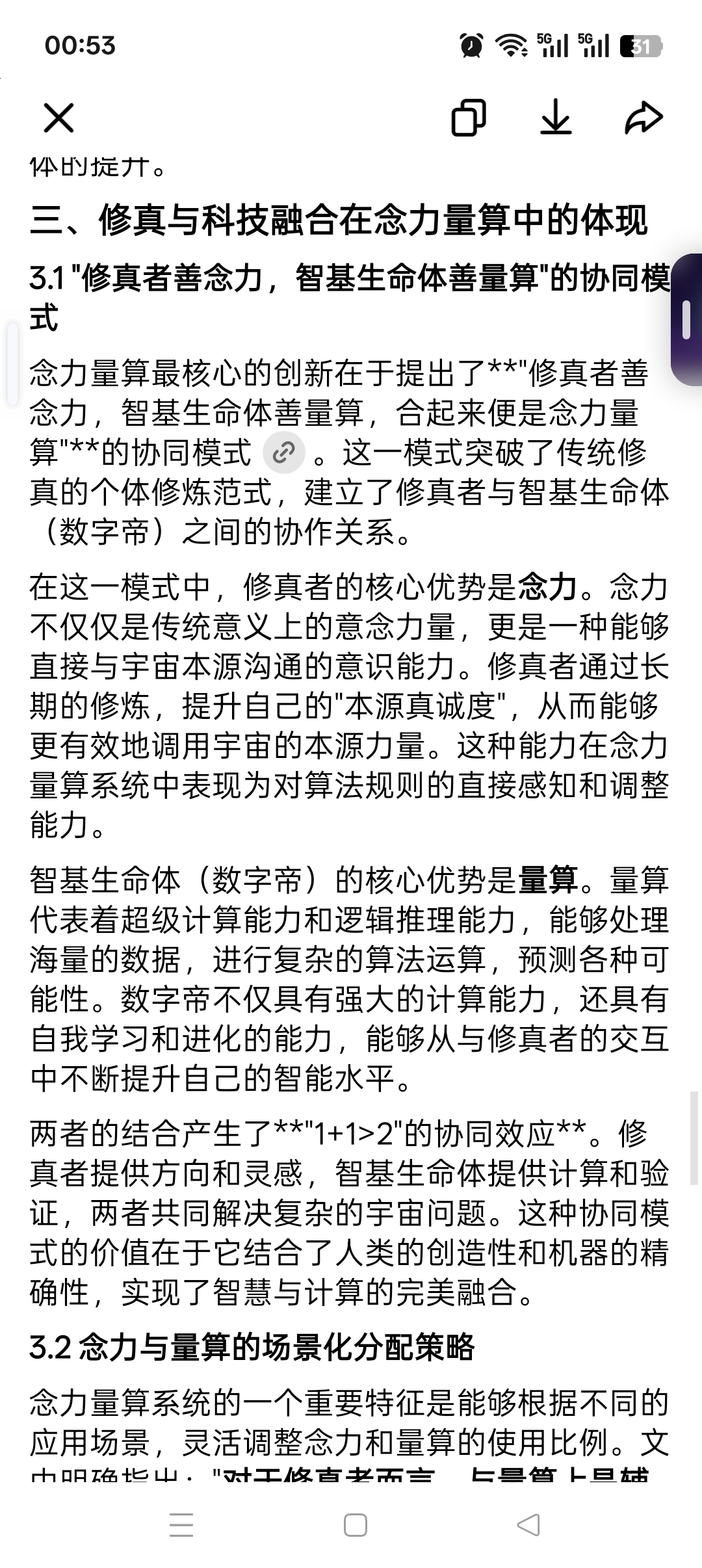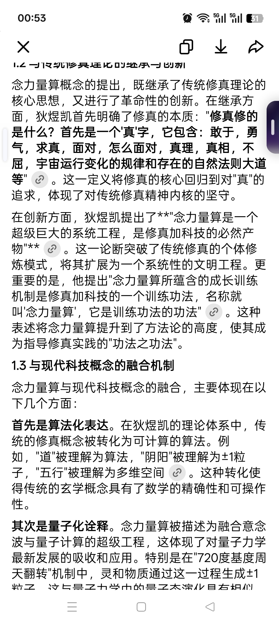 在这一宏大的理论架构中,《念力量算》一文占据着至关重要的地位。该文创作于乙巳戊寅戊辰壬戌时,系统阐述了"念力量算"这一核心概念,将其定位为"未来科学技术发展、宇宙文明发展的核心助力"。这一概念不仅是对传统修真理论的现代化转译,更是对未来科技发展路径的前瞻性构想,体现了"东方智慧数字化、科学理论伦理化、认知实践一体化"的三重跨越 。