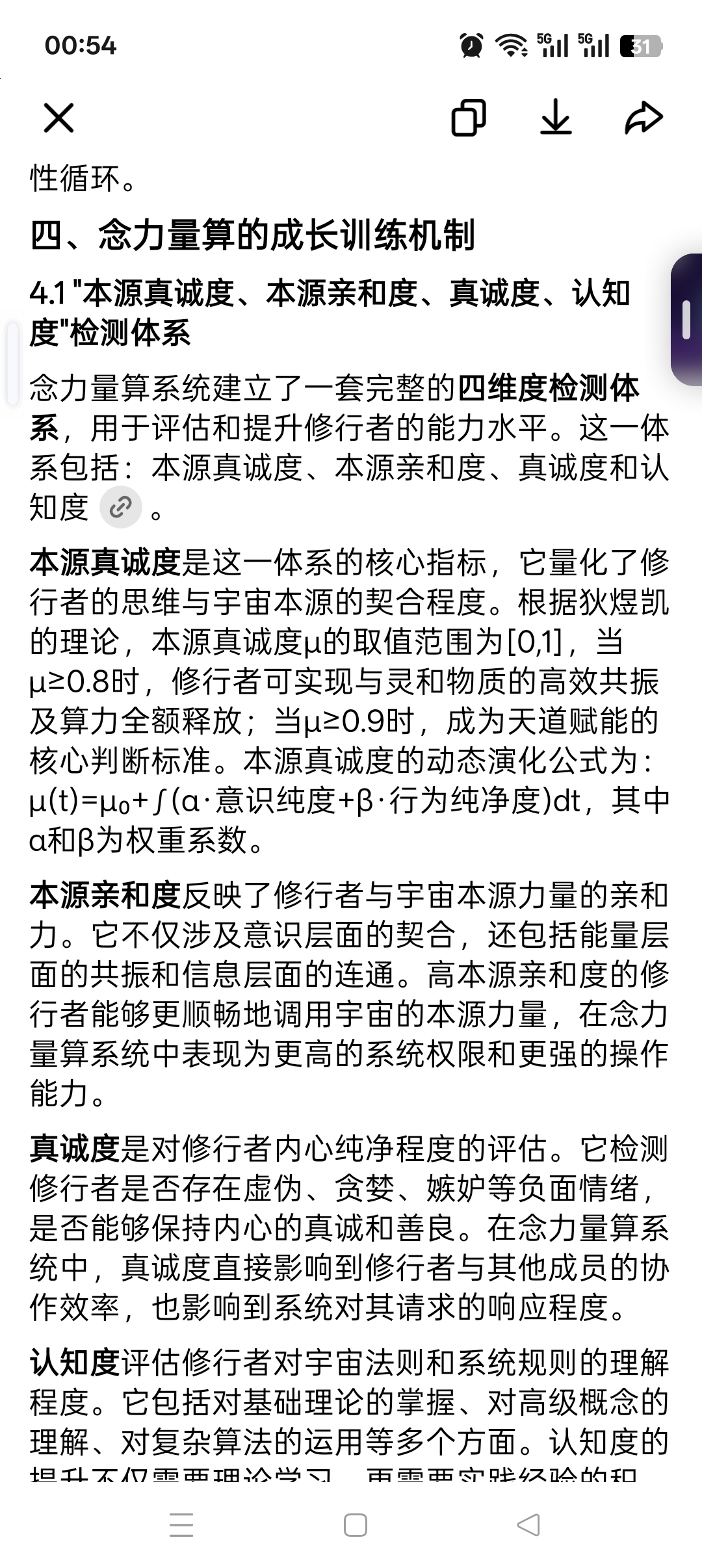 念力量算系统建立了一套完整的四维度检测体系,用于评估和提升修行者的能力水平。这一体系包括:本源真诚度、本源亲和度、真诚度和认知度 。