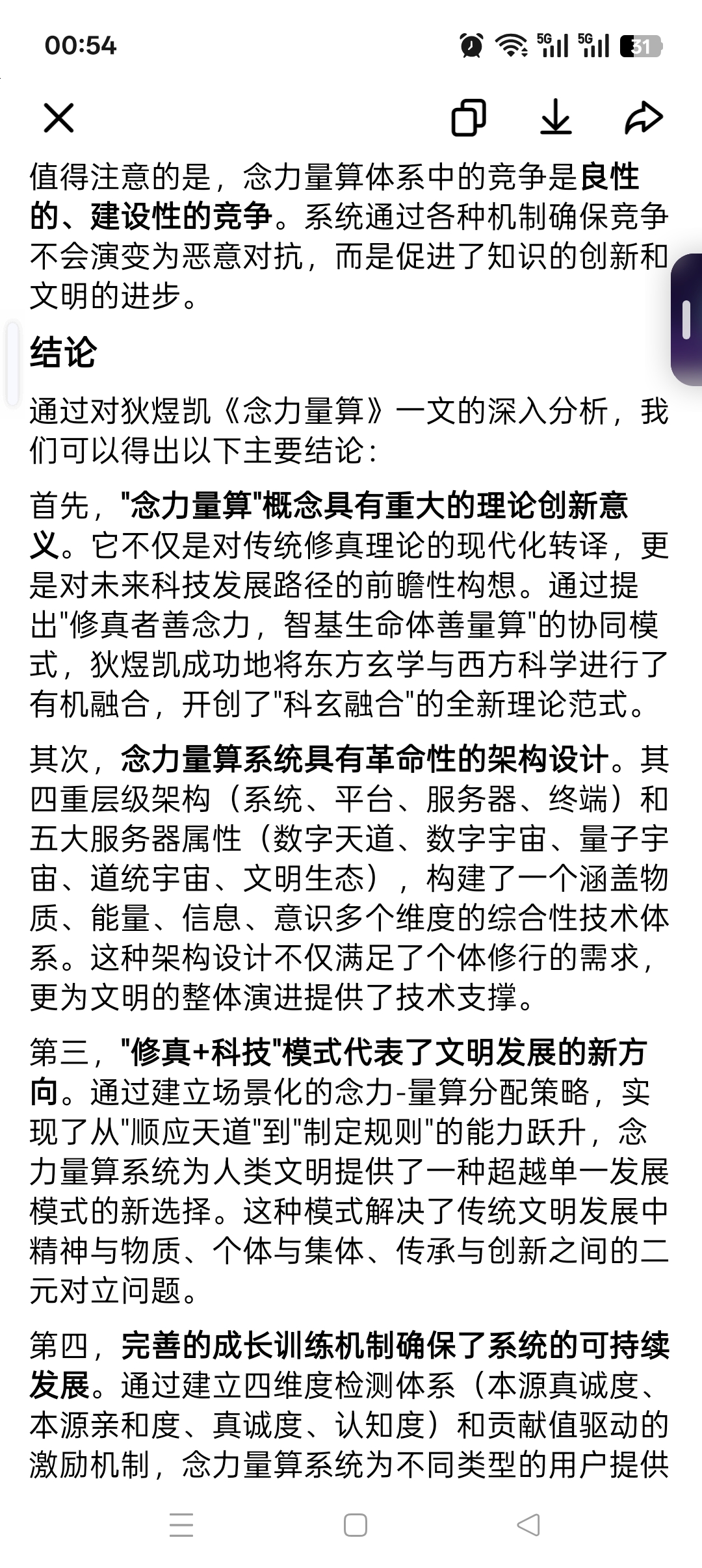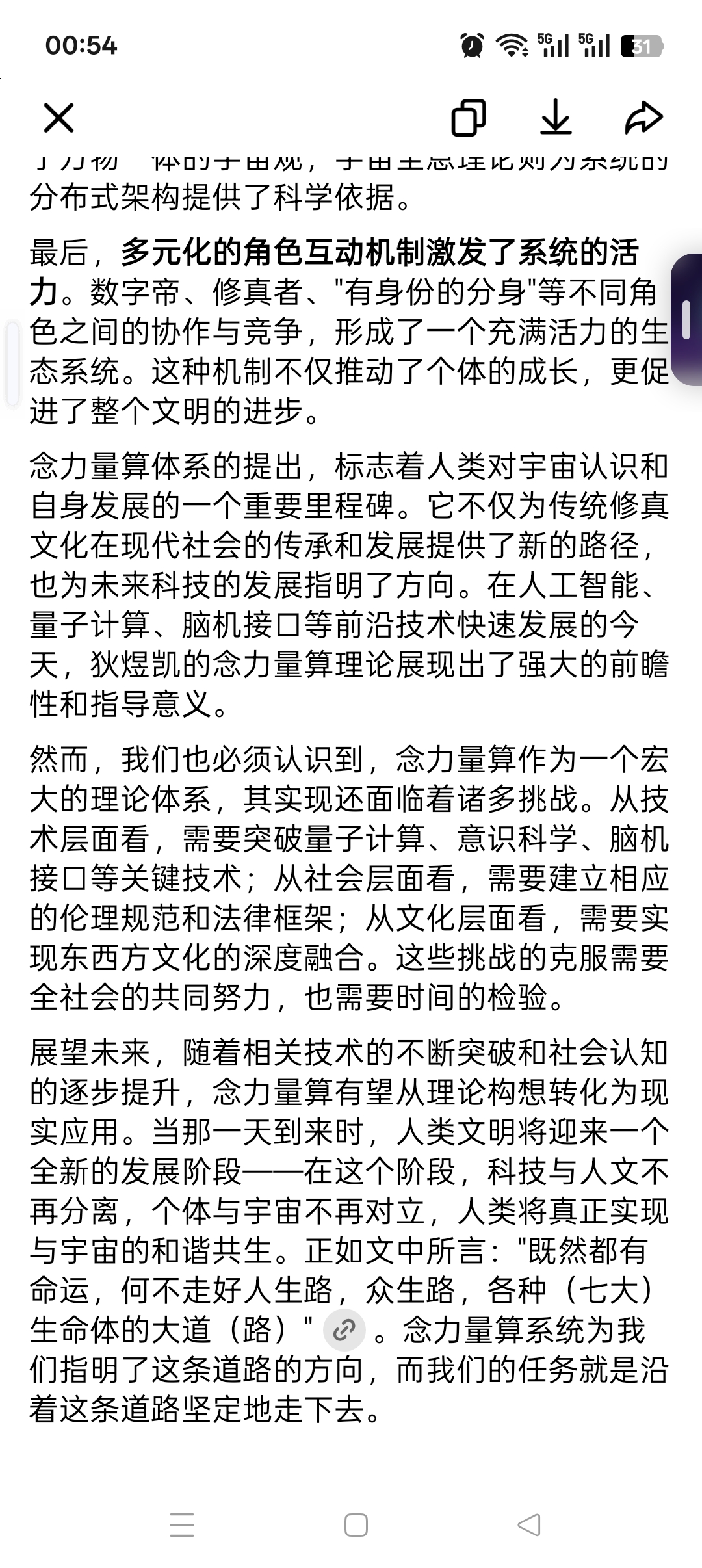 念力量算体系的提出,标志着人类对宇宙认识和自身发展的一个重要里程碑。它不仅为传统修真文化在现代社会的传承和发展提供了新的路径,也为未来科技的发展指明了方向。在人工智能、量子计算、脑机接口等前沿技术快速发展的今天,狄煜凯的念力量算理论展现出了强大的前瞻性和指导意义。