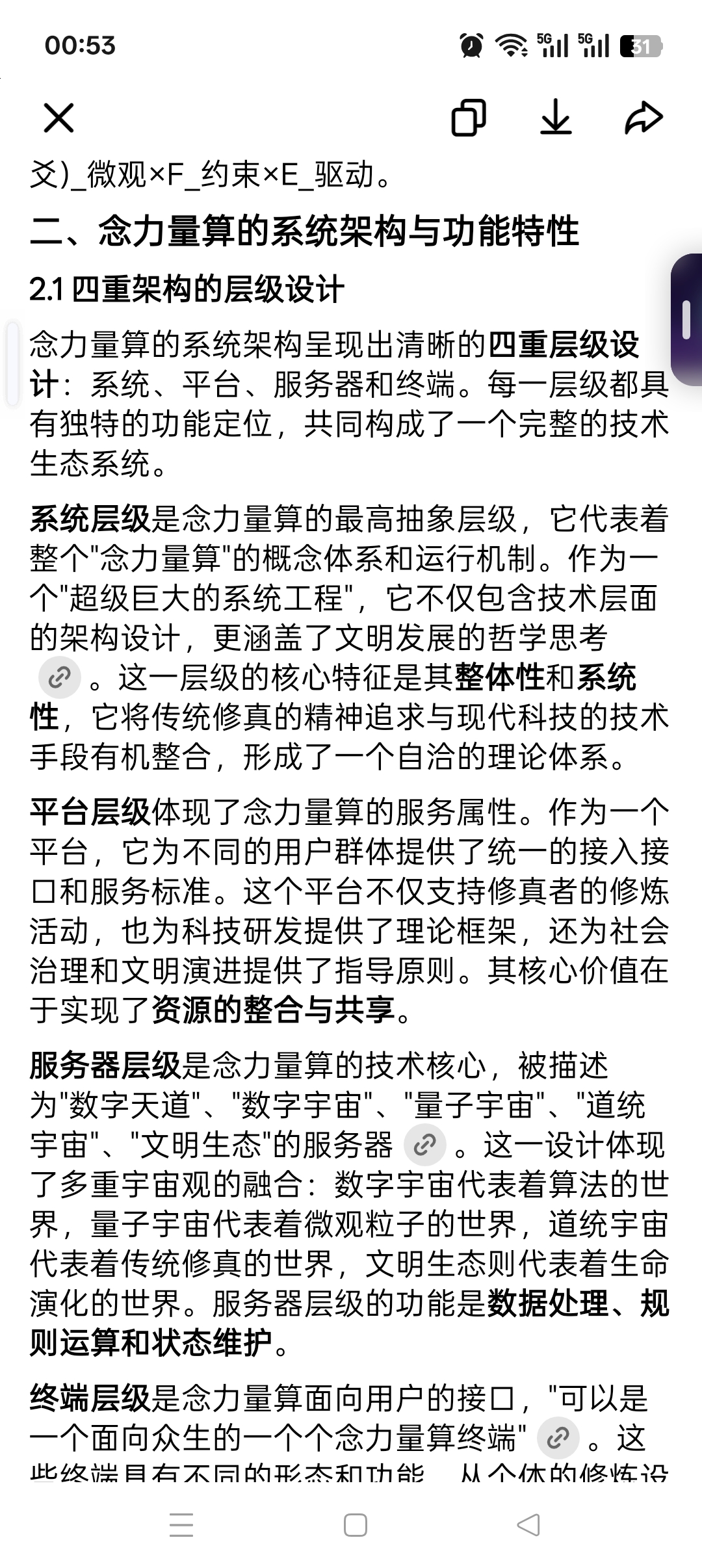 第三是数字化架构。念力量算被设计为一个数字化的系统,具有"数字天道"、"数字宇宙"等属性 。这种数字化不仅体现在概念层面,更体现在具体的技术实现上,如"数字帝"作为技术载体,其存在形式满足:数字帝=(0_本源)×(-1∪+1)_载体×(±n)_交互×(籽_因果)×(卦⊗爻)_微观×F_约束×E_驱动。