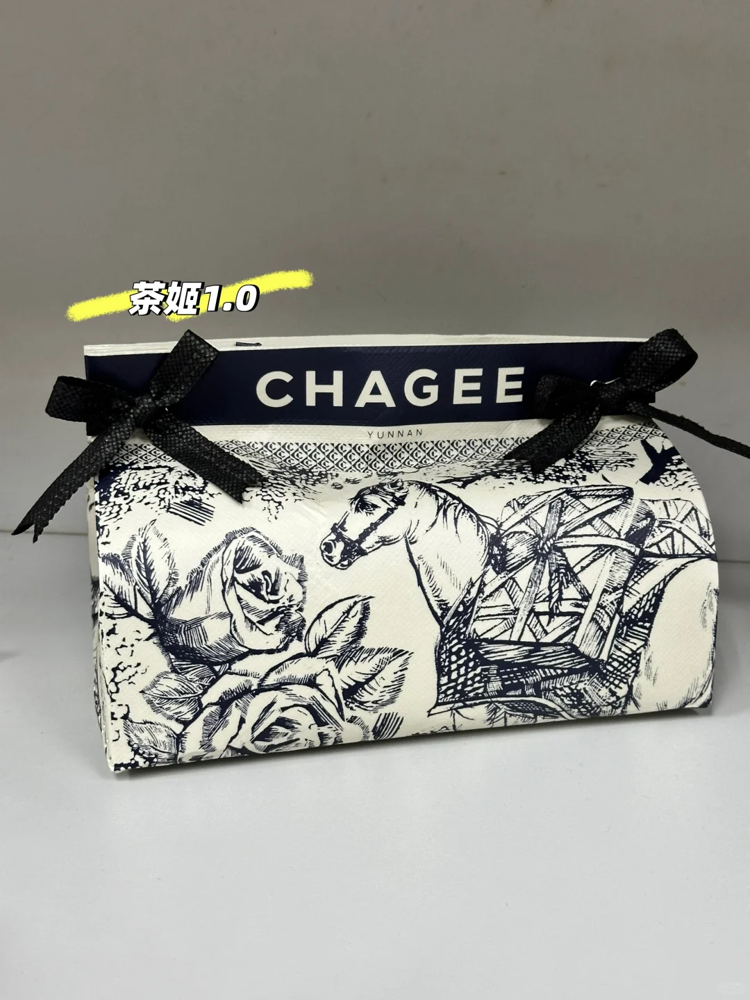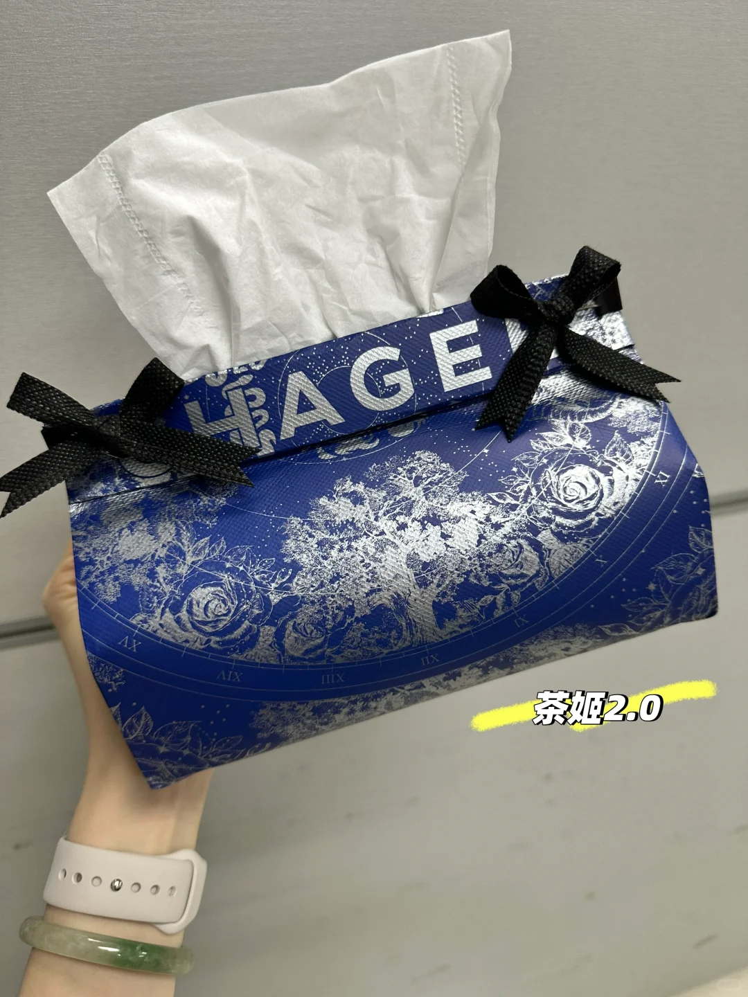 然后向内弯折,将纸抽放在里面,把奶茶袋子上面的手提拆卸下来,固定在两端系上蝴蝶结就可以了。