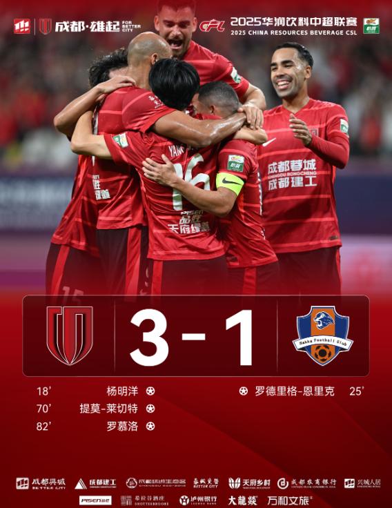 成都蓉城回到主场迎战梅州客家,整场比赛展现出强大的控场能力。第18分钟,罗慕洛送出精准直塞,杨明洋冷静推射破门。梅州客家通过快速反击一度扳平,但蓉城在下半场发力,莱切特与罗慕洛连续进球,最终以3比1拿下胜利。这场胜利让成都蓉城积分升至58分,紧追领先者,争冠希望依然光明。