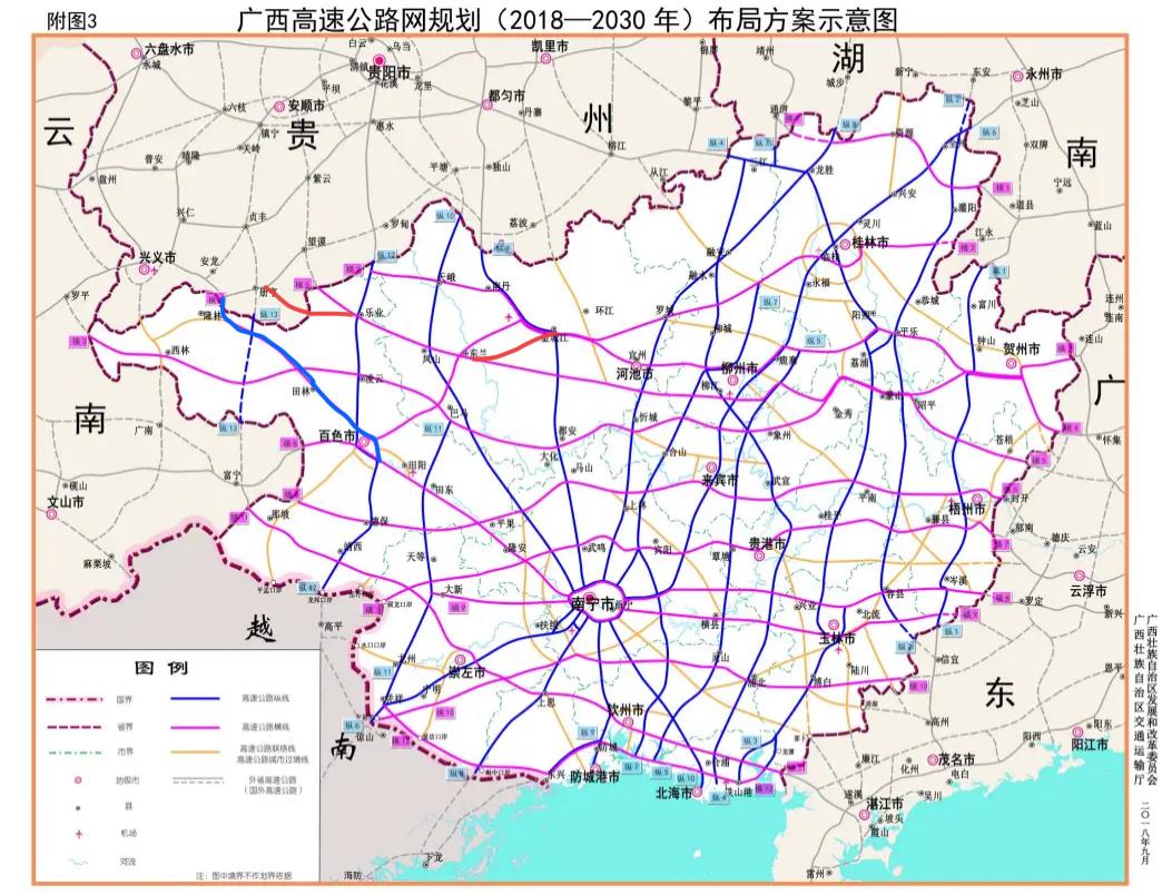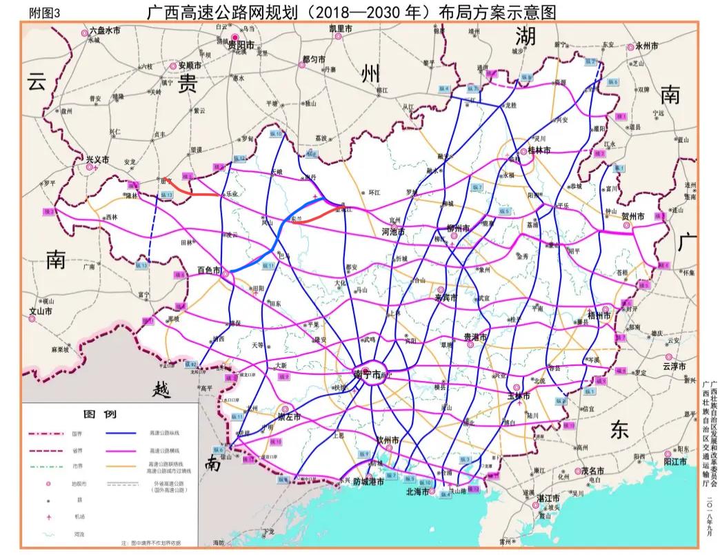9.册百高速:汕昆高速河池至兴义段路线调整了之后,原汕昆高速册亨至百色段调整为百册高速,如果广昆高速南宁至百色(桂云界)段扩建后仍然拥堵,再考虑把册百高速升格为国家高速。编号为广昆高速的联络线。编号为G8015。