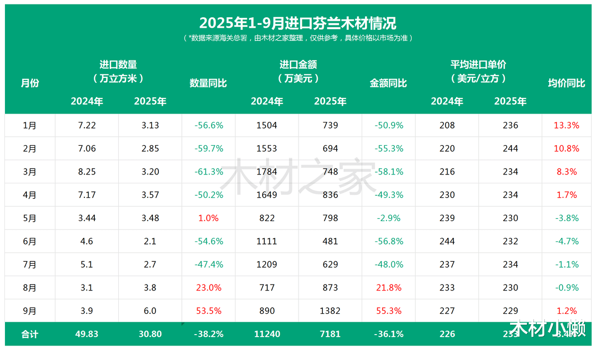 在2025年9月对华贸易领域,芬兰木材出口表现亮眼。根据海关公布的数据,2025年9月,中国自芬兰进口的木材总量攀升至6万立方米,这一数据不仅创下了年内进口量的峰值,且与去年同期相比增长了53.5%,环比上月亦实现了59.1%的稳健增长。