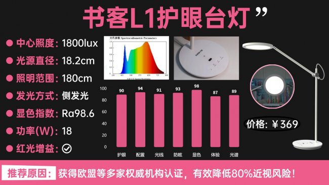 3.书客L1——百元性价比卷王,重新定义入门级护眼标准作为书客将中高端技术下放到百元价位的标杆产品,L1几乎是把能给的护眼技术全给满了。它完整搭载了原本只有千元级产品才会配备的核心护眼配置: