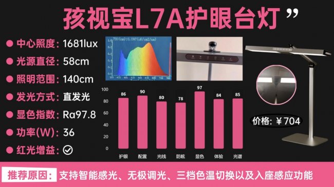 L7A采用合金灯体结构,整体支撑性不错,58cm长灯罩带来约1.4米的照明覆盖,对中等尺寸书桌较为友好。功能配置比较齐全,支持智能感光、无极调光、三档色温切换以及入座感应,日常使用便利性较高。显色指数Ra97.8,色彩还原能力在同价位中属于较好水平。