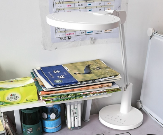 好视力TG068-S采用了相对少见的双立柱灯臂设计,在结构稳定性上表现还不错,日常调节角度时整体支撑比较扎实,不容易出现明显晃动,对孩子在不同坐姿下读写使用有一定适应性。灯头为直径约18cm的圆形造型,通过面光源与环形光源的组合,并采用侧发光方式来柔化出光,照射范围能够覆盖约1.2米的桌面面积。