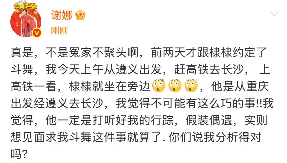 谁能想到,内娱的缘分比高铁速度还玄学!最近,谢娜在社交平台分享了一段趣事:她坐高铁时,一抬头竟撞见“显眼包”王鹤棣就在同一车厢!网友瞬间炸锅:“这俩人怕不是拿了晋江小说剧本?”“建议查查是不是偷偷装了‘偶遇导航’!”【偶遇现场:娜姐和棣棣的“社死”瞬间?】