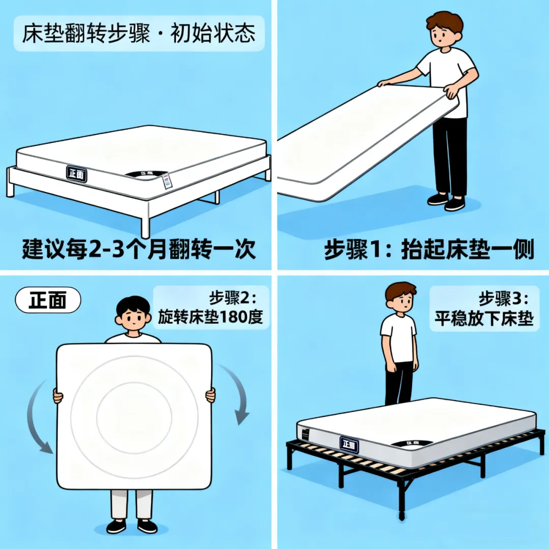 1.定期翻转:新床垫前1年,每2-3个月翻一次(正反、左右都要翻),让弹簧受力均匀;1年后每半年翻一次就行。