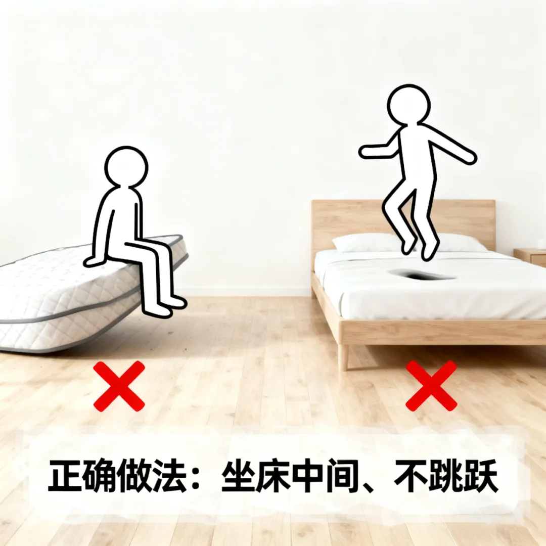 3.别让床垫“受力不均”:别经常坐在床边缘,四个角最脆弱,坐久了容易塌;也别在床上跳,单点受力太大会弄坏弹簧。