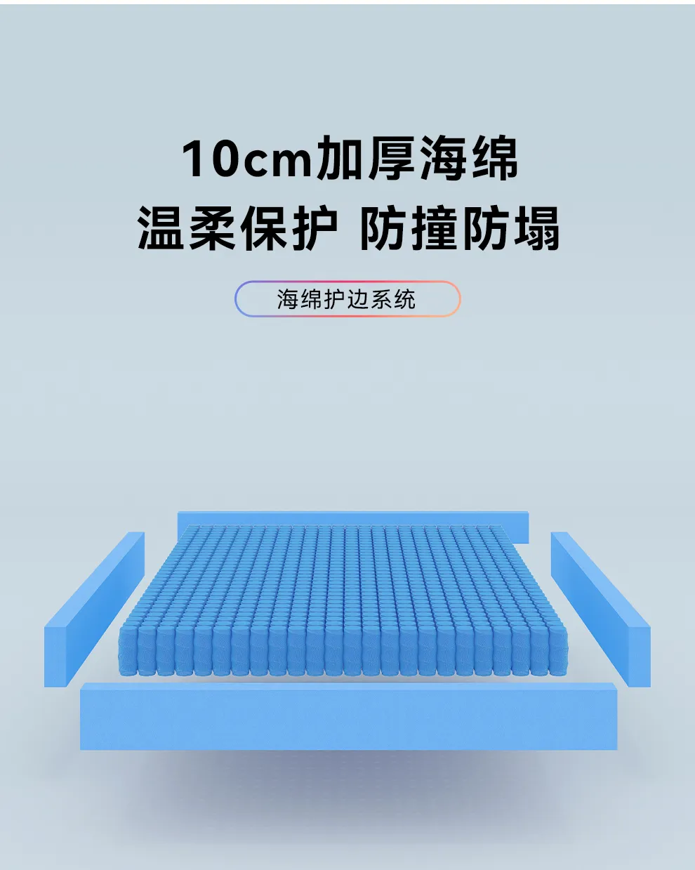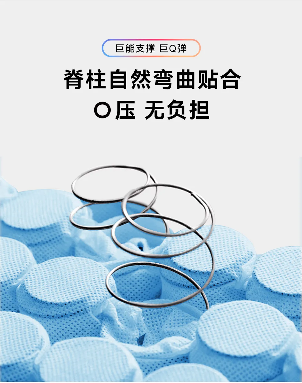 1.支撑性优先:优先选“独立袋装弹簧+分区设计”的,能精准托住腰、肩、腿,伴侣翻身也不会吵醒你。家里有老人的,支撑性一定要够,避免睡软塌的床垫。