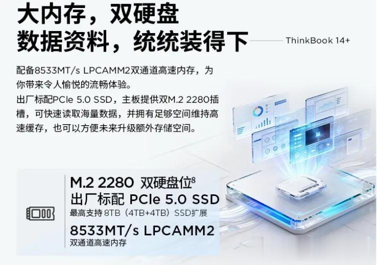 ThinkBook 14+/16+ 2026酷睿版仍然配有双M2 2280固态硬盘插槽,并且出厂标配PCIe5.0 SSD,预留空硬盘插槽,可拓展至8TB超大存储容量。