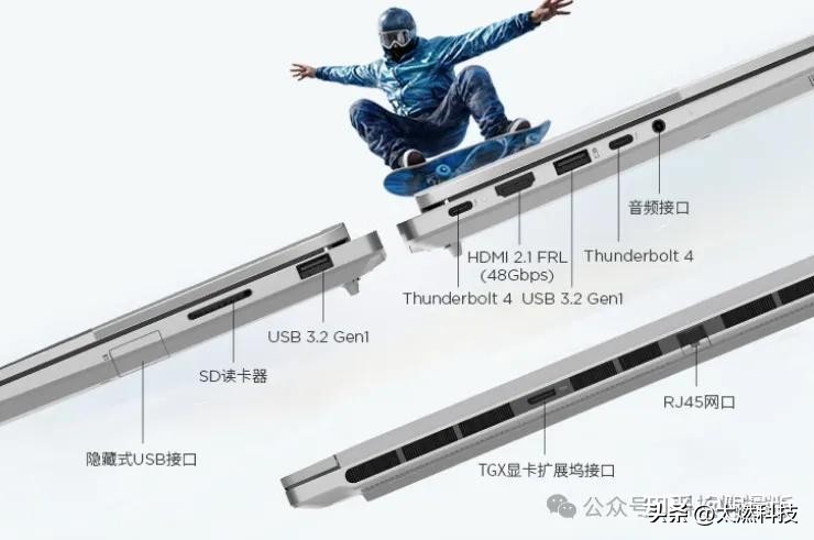 十大全能接口:ThinkBook 14+/16+ 2026的机身接口仍然是轻薄笔记本中最丰富最实用的,没有之一,比很多游戏笔记本的接口还多。有三个 USB-A 接口,其中包含两个USB-A 3.2 Gen 1和一个隐藏式 USB-A 接口,两个都支持雷电4的USB-C接口,支持140W充电,一个 SD 卡读卡器、一个 HDMI 2.1 接口、一个 TGX 显卡扩展坞接口、一 个 RJ45 网口、一 个 3.5mm 音频接口。ThinkBook 14+ 2026的读卡器也终于从之前的TF插槽改为全尺寸的SD读卡器。由于立轴设计,部分接口布局在机身后侧。