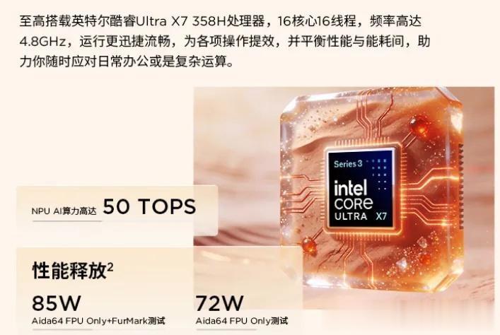 最大亮点在于其集成英特尔 Arc B390 锐炫核芯显卡,基于Xe3架构,拥有12个Xe核心,动态频率最高可达2.5GHz。核显与RTX4050独立显卡的性能相当。支持XeSS 3.0技术,可提升游戏帧数。内置第五代NPU(神经网络处理器),AI算力高达 50 TOPS,相比上一代提升近4倍,约等于RTX4050。处理器CPU+GPU+NPU的总算力可达 180 TOPS,能高效支持本地大模型部署和各种AI应用,同时降低功耗。