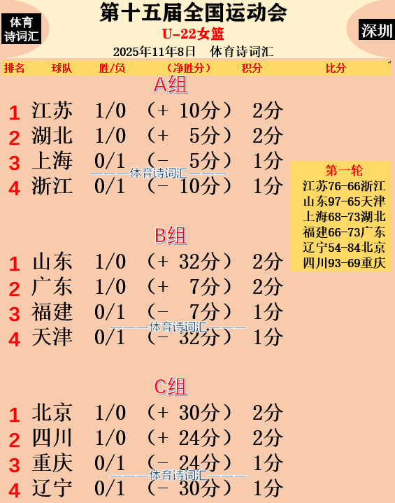 目前积分榜排名如下:A组:1、江苏1胜(净胜10分);2、湖北1胜(净胜5分);3、上海1负(净输5分);4、浙江1负(净输10分)。