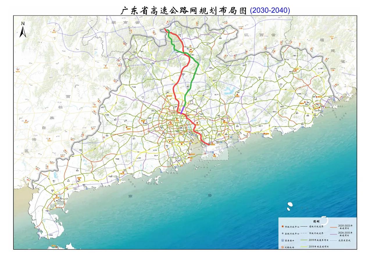图中红色线路为京港澳高速新路线,绿色线路为新乐广高速,紫色线路为大广高速