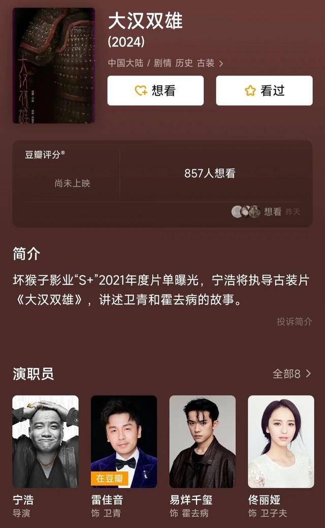 借用成功案例、照猫画虎、跟风抢拍历来都是电影市场的恶习,但有时候却是捷径的必经之路。宁浩坏猴子影业最新项目《大汉双雄》正式启动,预定2024年春节档上映!该片由宁浩导演,徐峥编剧,雷佳音饰卫青,易烊千玺饰霍去病,佟丽娅饰演卫子夫,黄晓明客串汉武帝,另外黄渤,徐峥也将参演。 影片讲述汉武帝时代卫青和霍去病抗击匈奴保家卫国的故事。