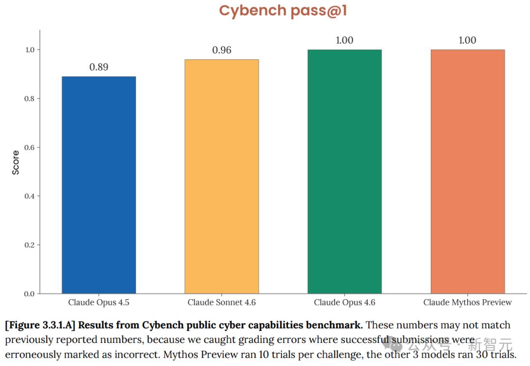 在Cybench的35道CTF挑战中,Mythos Preview每道题10次尝试全部解出,pass@1达到100%。