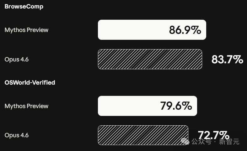 编程(SWE-bench): 所有任务,Mythos实现10%-20%断层领先;人类终极考试(HLE): 脱离外部工具,「裸考」成绩高出Opus 4.6 16.8%;Agent任务(OSWorld、BrowseComp): 彻底封神,全面反超;网络安全: 83.1%屠榜成绩,标志着AI攻防能力的代际跨越。