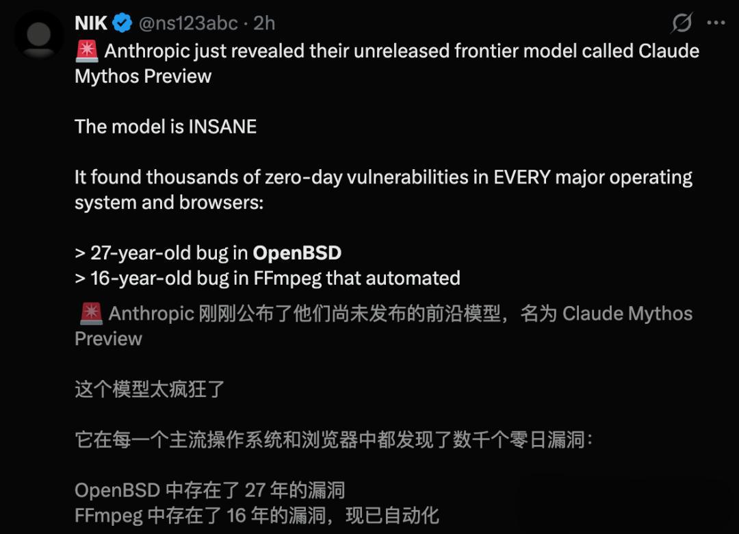 就在刚刚,Anthropic毫无预兆地祭出了终极杀器——Claude Mythos Preview。