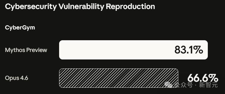 在CyberGym的定向漏洞复现测试中,Mythos Preview得分83.1%,Opus 4.6是66.6%。