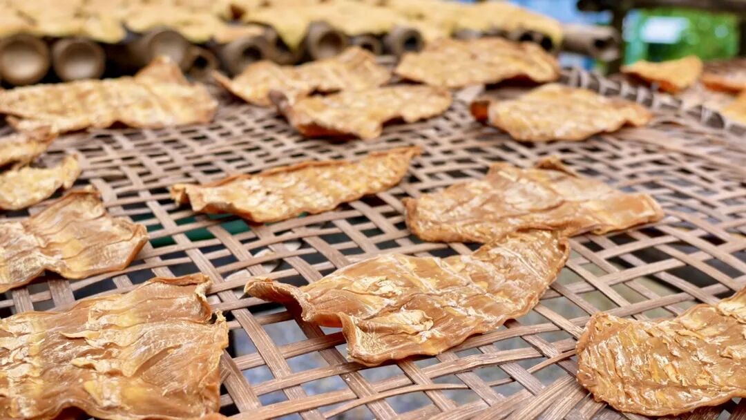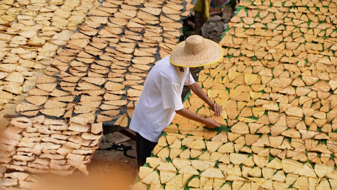 “煮好的笋还要密封装桶发酵,几天后才能拿出去晾晒。”经过数日晾晒,骆坑笋干逐渐呈现出独特的琥珀色。
