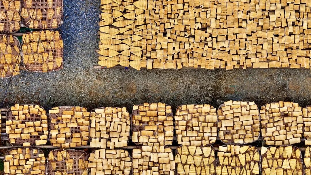 家家户户的庭院里,竹匾上整齐铺晒着金黄的骆坑笋干,在阳光下泛着温润光泽,空气中弥漫着竹笋特有的清香。这一延续百年的晒笋场景,不仅是骆坑村独有的秋日风景,更承载着当地村民对非遗工艺的坚守与传承。